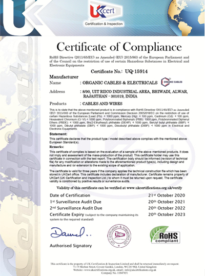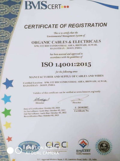 "ORGANIC CABLES" is an ISO-9001:2015,ISO 14001 CE, RoHS certified company, where cables are manufactured as per national & international standards and customer's specifications.